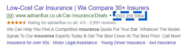 When setting up a call extension, you’ll have the option to enable “call reporting” – this means Google will display a different number on your ads, that will reroute calls to your set number, allowing Google to track how many calls have been made as a result of your ad. In the UK, a trackable number will usually show with a 0333 dialing code, but this enables Google to list any calls as conversions, something which is useful for enhanced “maximise conversions” bidding.